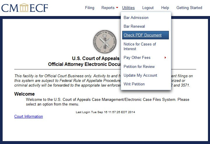 1. Log in to CM/ECF. On the welcome page, click on Utilities > Check PDF Document.