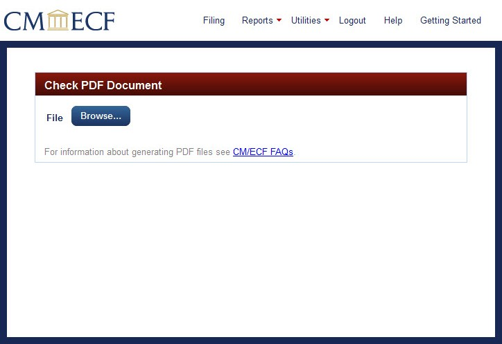 The Check PDF Document function on the Utilities menu is used to determine whether a PDF is corrupted and whether the PDF includes a malicious link or a link that launches a program. The CM/ECF system will reject a PDF that is corrupted or contains a malicious or program-launching link.