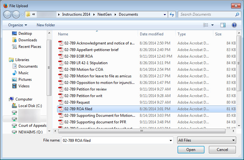 The File Upload dialog box opens. Navigate to the folder containing the PDF. Select the PDF file to attach by clicking the file name. The file name appears in the File name box near the bottom of the dialog box.