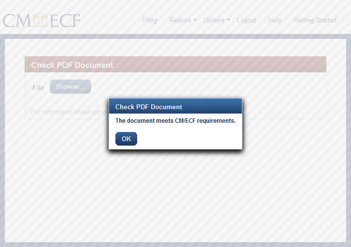 If the PDF does not meet CM/ECF filing requirements, a popup box opens with a brief description of the problem. For example, the popup box may have the message,
