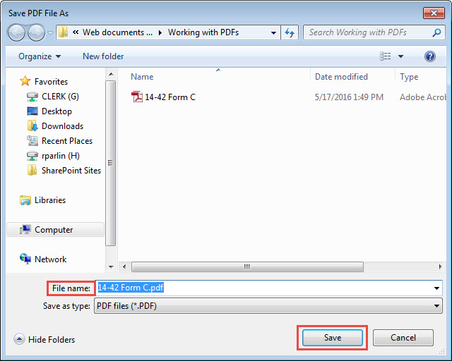 5. In the Save PDF File As box specify the location to save the printed, flattened version of the fillable form. Click Save.