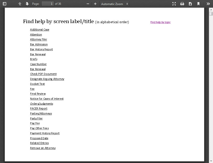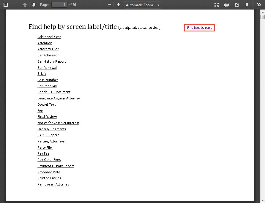 Another list of help topics appears when the user clicks Find help by topic on the first page of the Help PDF.