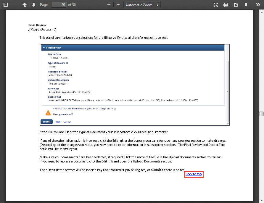 After reviewing the information, click the Back to top hyperlink at the bottom right of the section to return to the first page.