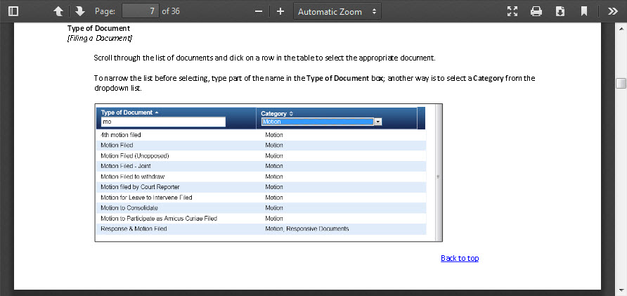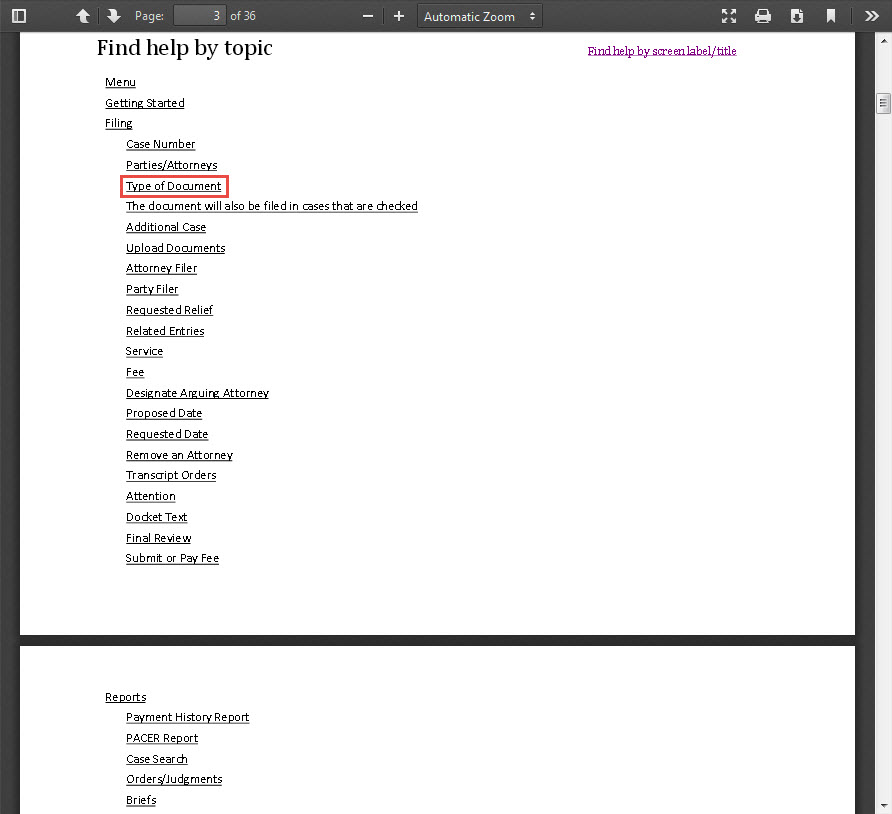 Click on any of the hyperlinked topics or sub-topics to see the help pages. The Filing > Type of Document help page is shown below.