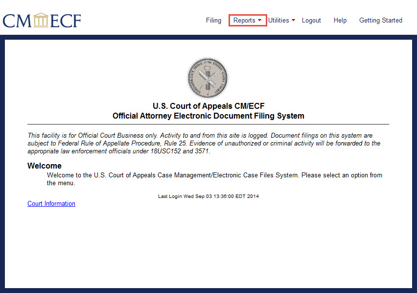 To the right of the Filing option on the CM/ECF NextGen welcome screen toolbar is the Reports option.