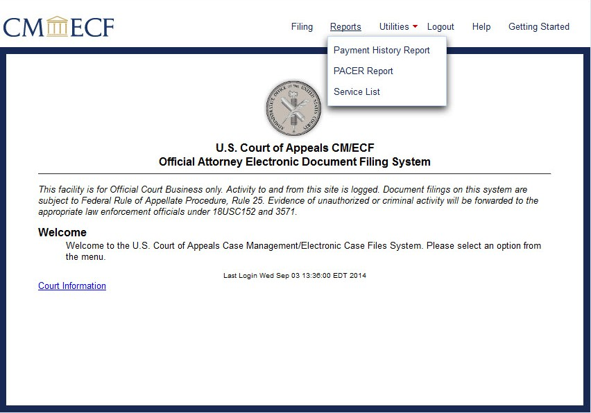 Click the red triangle to view the three types of reports available in CM/ECF NextGen: Payment History Report, PACER Report, and Service List.