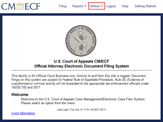 The middle tab on the NextGen CM/ECF welcome screen toolbar is marked Utilities.