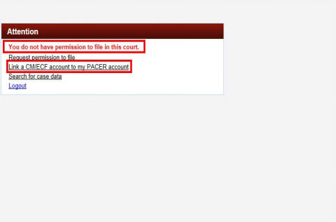 Note that the message at the top of the screen that says, "You do not have permission to file in this court" will not be displayed again for this court once the filer has completed linking the CM/ECF and PACER accounts.
