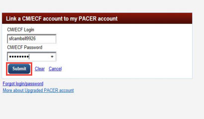 On the screen that opens, enter the filer's existing CM/ECF username and password. Click Submit.