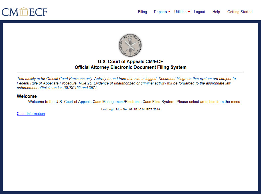 When the system completes the link between the filer's upgraded PACER account and existing CM/ECF account, the Second Circuit's NextGen CM/ECF screen opens.