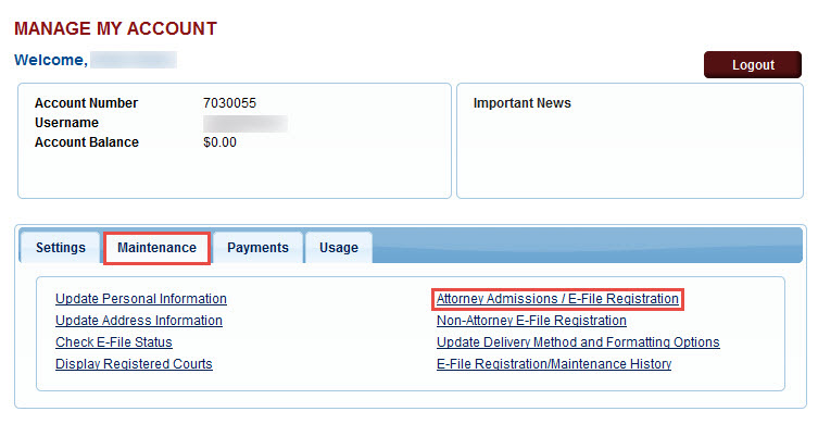 To register for e-filing privileges, click the Maintenance tab on the