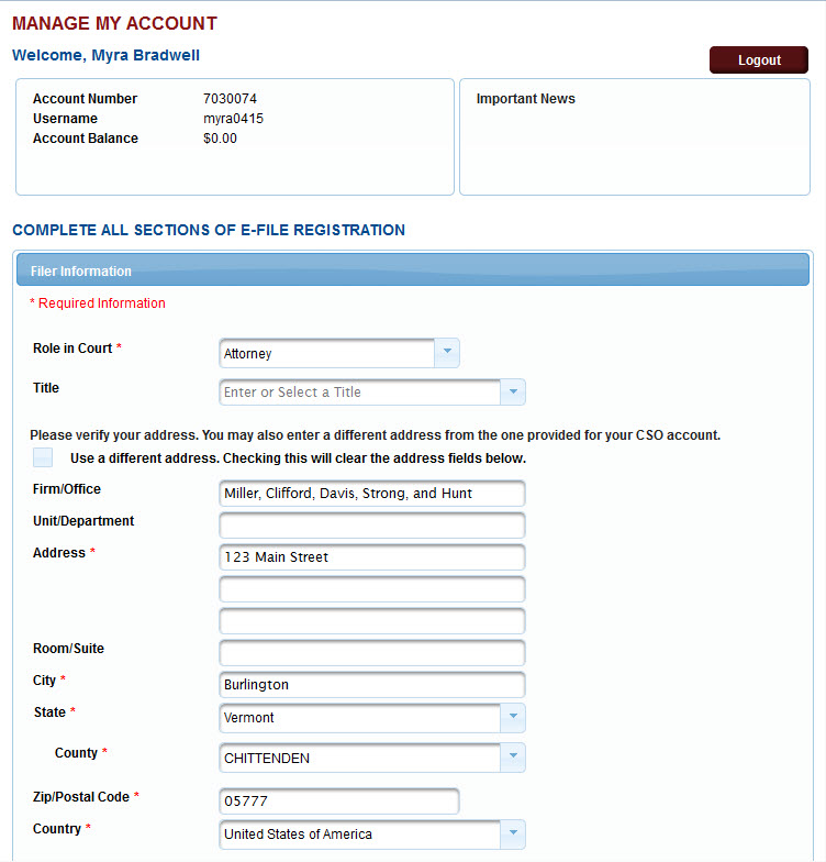 e-filing registration, along with any additional information or instructions. Click