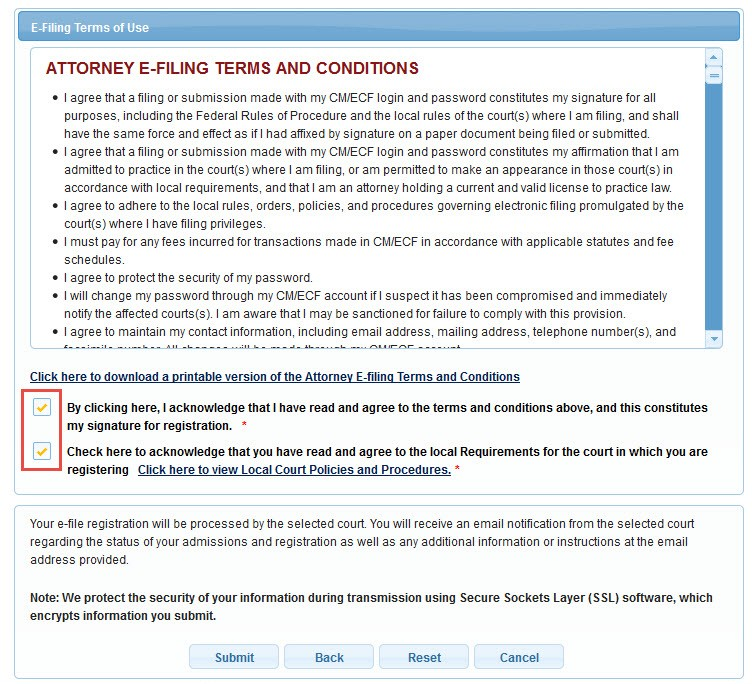 After entering or skipping the payment information, the last page of the registration process opens. Read the e-filing policies and procedures and check