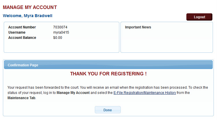 The Confirmation Page opens. Court staff will process the registration. The registrant will receive an email notification regarding the status of the