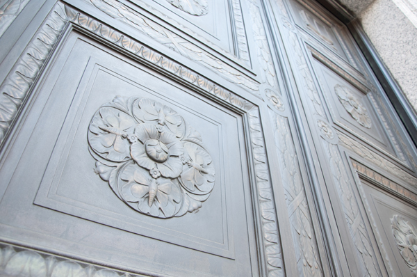 Designed by Cass Gilbert, this is one of eleven typical tower trial courtrooms. The bench, jury box, and rail were all rebuilt as part of the renovation. The new millwork is oak, to match the original wall panels still in place. Decorative carvings of wreaths and floral patterns fill the spaces above each arch.